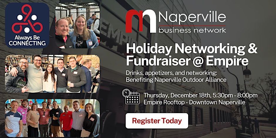 Naperville Business Network in collaboration with Always Be Connecting would like to invite you to our holiday networking event and fundraiser on Thursday, December 18th at Empire Burgers + Brew in downtown Naperville. This event will take place on Empire's glass-enclosed rooftop in a fun setting overlooking downtown Naperville. This is a great opportunity to mingle with other go-getters and grow your business network.