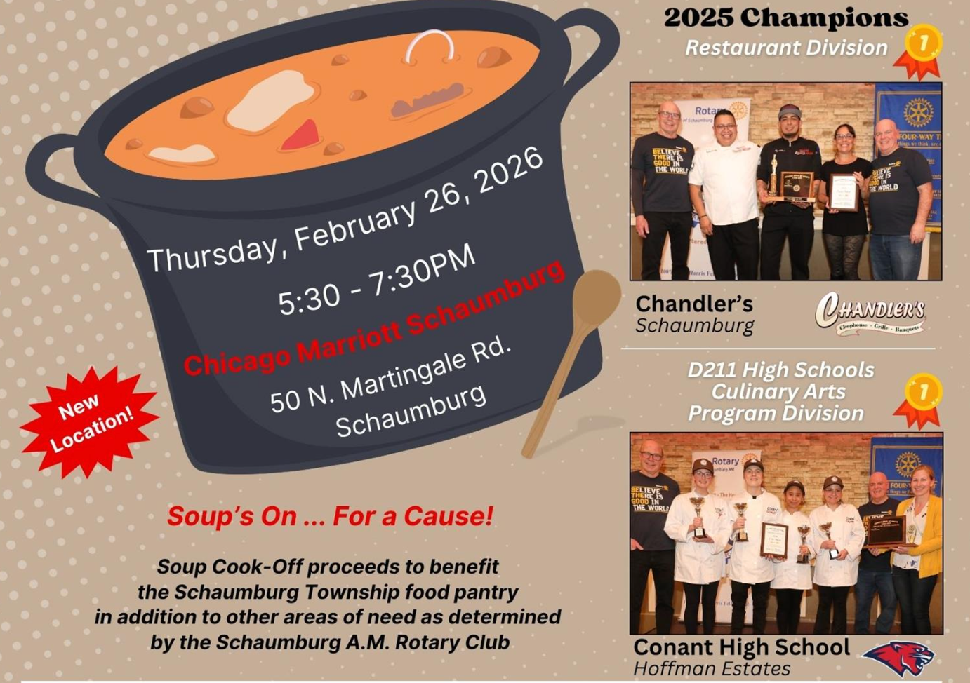 Participants will sample soups prepared and served by area restaurants and students enrolled in the D211 high schools culinary arts program (Conant, Fremd, Hoffman Estates, Palatine and Schaumburg) and vote for their favorite soups.
