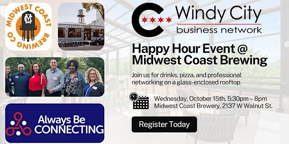Windy City Business Network and Always Be Connecting are teaming up on Thursday, August 28th from 5:30 pm - 8:00 pm at Midwest Coast Brewing Co.'s rooftop in Chicago! This is a great opportunity to mingle with other go-getters and grow your business network.